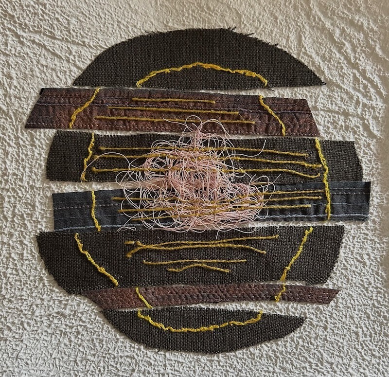 Sue Evans also studied Fine Art as a mature student. On graduation she became a founder member of SVAF and subsequently gained her MFA at West Dean. Sue experiments with and investigates the qualities of cloth, usually repurposed fabric, by layering, fraying, weaving and distressing to make surfaces on which to stitch. Images seek to provoke t whether they are forming, disintegrating, renewing or decaying.